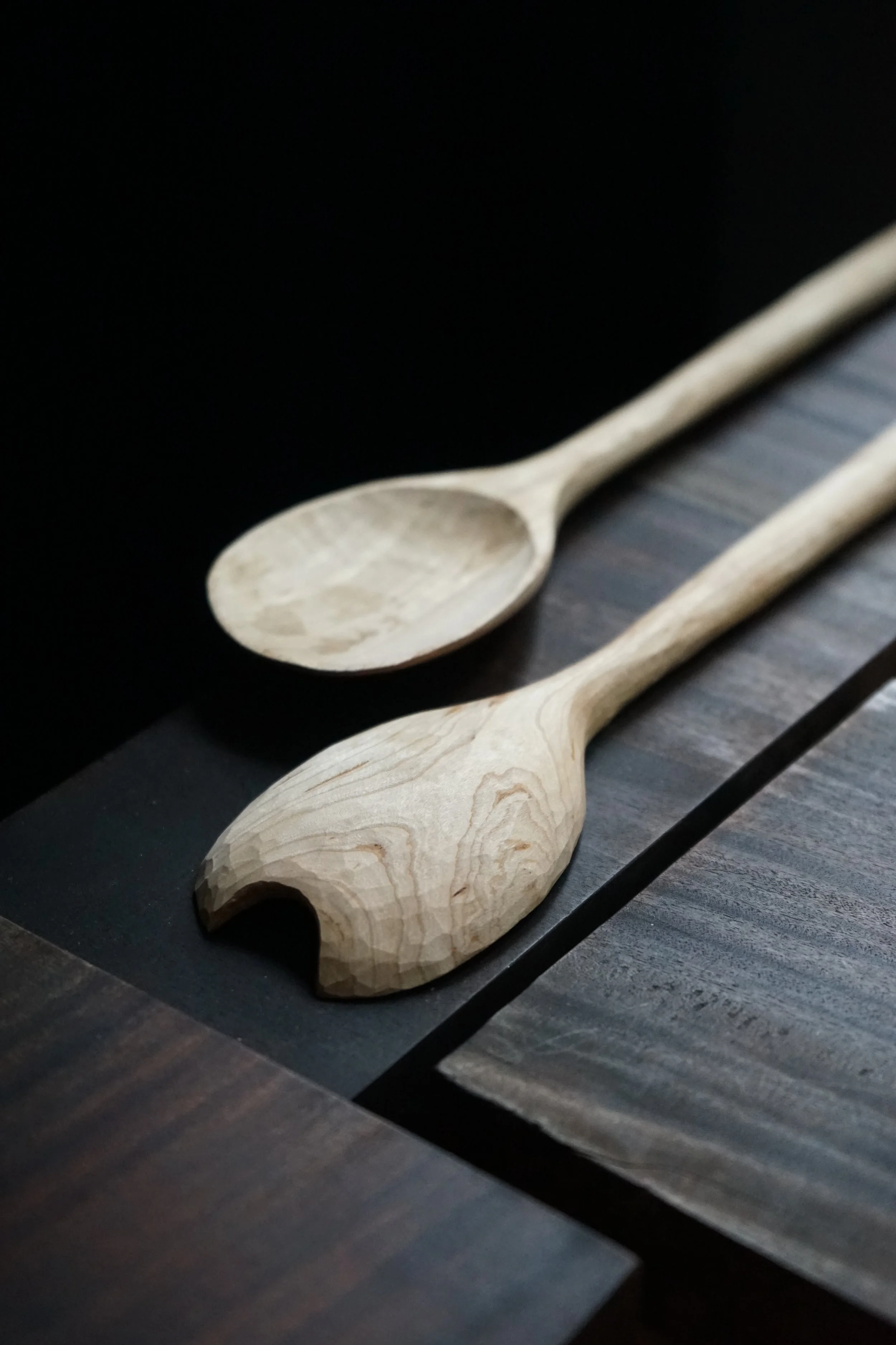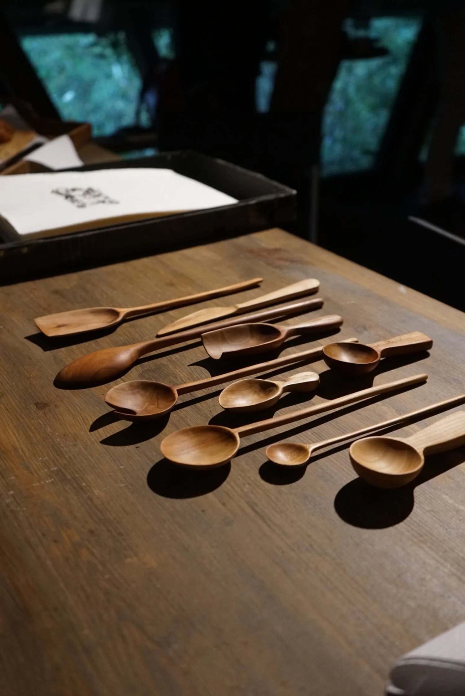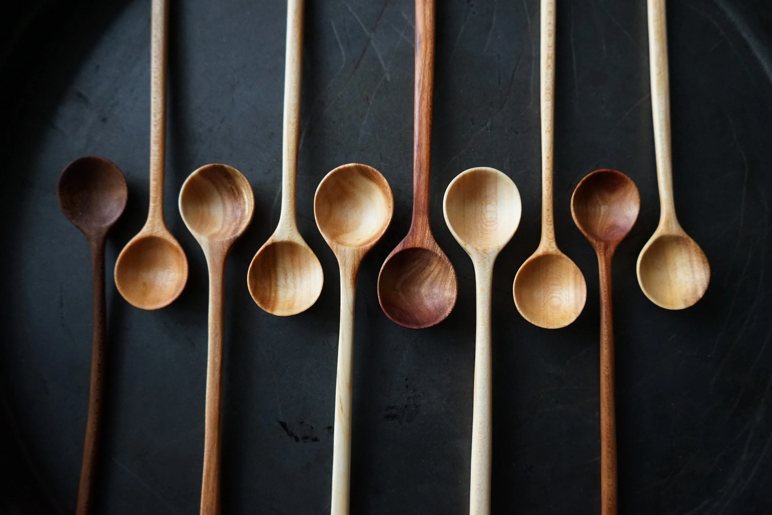 Kleine Löffel für Salz, Zucker, getrocknete Kräuter. Einige sind naturbelassen, andere wurden gebacken. So entsteht, obwohl alle aus dem gleichen Holz geschnitzt sind, eine große Variation an Farbtönen.