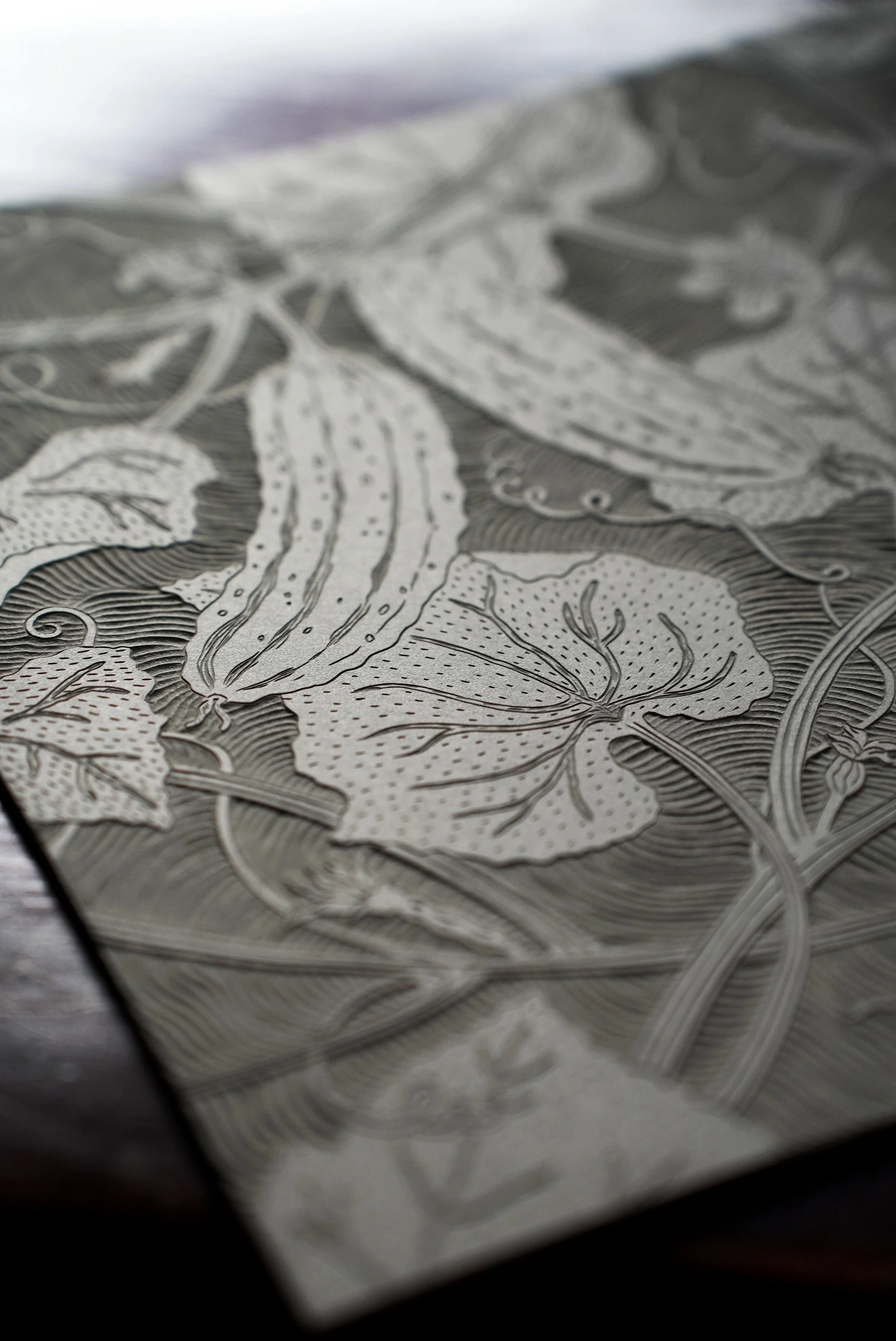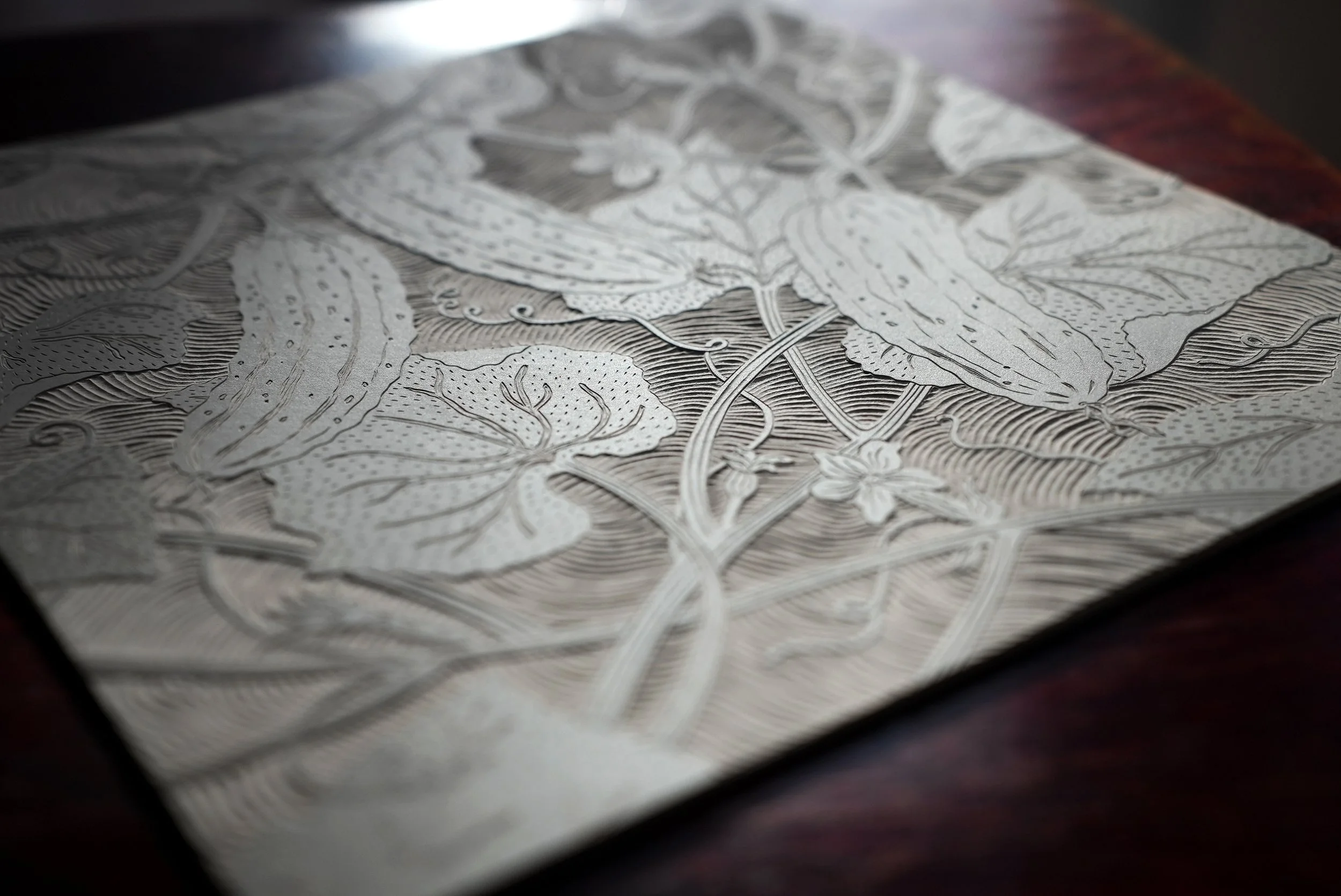 Einer fertig geschnitzten Druckplatte wohnt ein ganz eigener Zauber inne. Im Gegenlicht entfaltet sich ihre Dreidimensionalität.